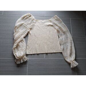 This ivory top by Arula features a luxurious knit bodice and sheer puff sleeves with smocked details. Shimmer accents add sophistication to its elegant design.
