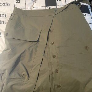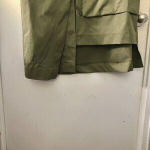 Army green asymmetrical skirt. Never worn before. I purchased this skirt from Temu last year, and it did not fit. Fits more like a large or extra large. So sad to have to sell it, but I have to let it go. I hope someone can get good use out of this skirt. It is a high/low skirt based on the placement of the material. It is a wrap skirt with a belt for opening and closing. Has buttons along the front all the way to the bottom for opening and closing. Has a high and low pocket on the front. The high and low pockets extend slightly to the back, still in PERFECT condition. Material is listed as 95% polyester and 5% spandex. Measurements can be found below:
