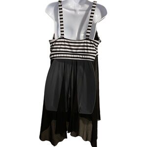 Women’s Asymmetrical Plus Size 22W Black/White Semi Sheer At Waist Swim Tankini Dress. Built in shelf bra with removable pads. Adjustable straps. Ties in middle of breast area.