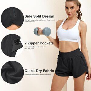 Features: These high-waisted shorts are made from a breathable, quick-dry polyester-spandex blend that keeps you cool and comfy during workouts. They have a flattering fit with an elastic waist, plus deep zipper pockets perfect for your phone, keys, or snacks. The side split design adds extra movement and ventilation, while the soft inner liner ensures no chafing during even the toughest routines.