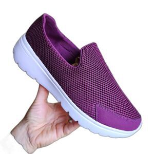 The product is a women's athletic slip-on shoe by Athletic Works in a maroon red color, featuring a geometric pattern and round toe design. It is made of lightweight knit fabric, suitable for various occasions such as travel, activewear, casual outings, and workwear. The shoe is designed for all seasons and is easy to put on with a slip-on closure. Ideal for women looking for comfort and style in their footwear, this loafer-style slip is a versatile choice for everyday wear. New, no tags.