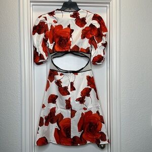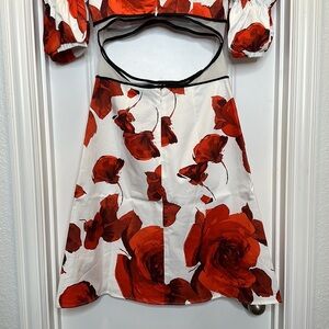 This knee-length creation is adorned by oversized red floral blooms and framed with double puff sleeves. Designed in cotton sateen with a hint of stretch, a double back zip and side seam POCKETS❤️.