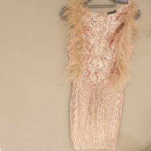 This is a medium dress, with sequins & feather around the sleeves. The brand is BANJUL,