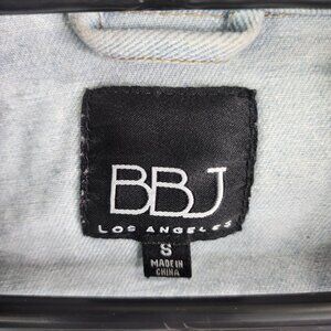 This BBJ Los Angeles denim jacket offers a chic, edgy look with its light wash and distressed details. The studded cuffs provide a fashionable touch.