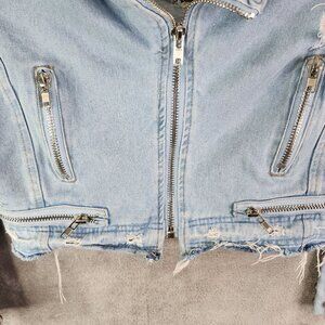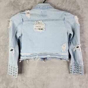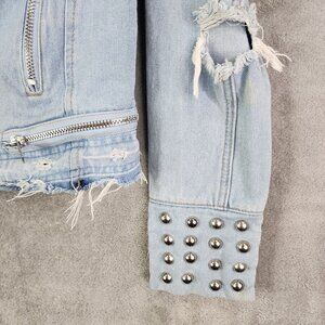 Womens BBJ Distressed Blue Denim Crop Jacket Studded Cuffs Full Zip Size S