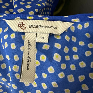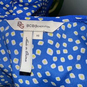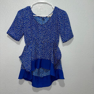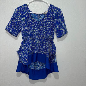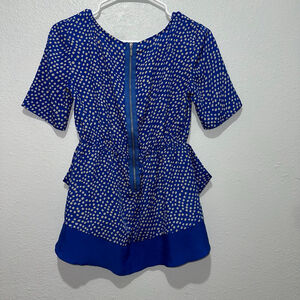 "This BCBGeneration women's blouse in size XS features a royal blue base with an all-over white and light yellow polka dot pattern. It has short sleeves, a V-neckline, and a peplum waist with a ruffled, high-low hem. The back includes a full-length blue zipper for closure. The fabric appears lightweight. No significant imperfections are visible, consistent with a pre-owned item."