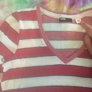 Women’s BDG v-neck striped sweater. Red and white large stripes with teal and purple small stripes. Size medium. Worn a couple times.