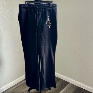 Stylish black jogger pants featuring a white logo. Perfect for casual wear.