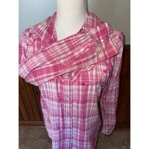 This shirt is in excellent pre-loved condition! No rips or stains! This shirt is a lightweight pink and white plaid design with snap buttons down the front. There is a cute little pink design by the collar as you can see in the picture. Measurements are in the photos. Womens size medium.