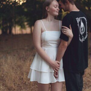 Features: Flirty, lightweight white dress with a playful back bow and adjustable thin straps. Made of soft, stretchy polyester that drapes beautifully, creating a flattering A-line silhouette. Ideal for showing some skin while staying cute and comfortable.