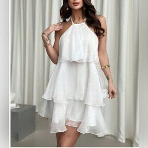 Women's Backless Layered Hem White Organza Halter Swing Dress White