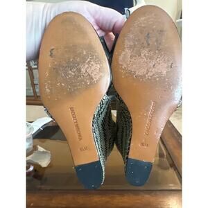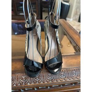 Black patent leather wedge with black and beige woven heel. 4” heel and an ankle strap