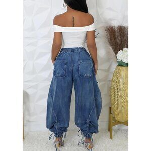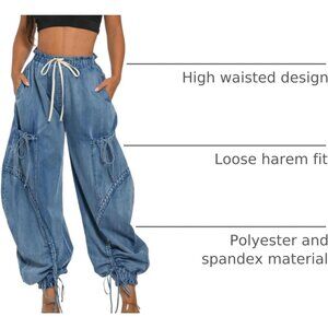 Features: These high-waisted, wide-leg denim joggers with a loose, roomy fit are perfect for casual days or dressing up for a night out. They feature multiple pockets, a drawstring for a customizable fit, stretchy fabric that's super soft and skin-friendly, and a fun, trendy silhouette. Ideal for anyone who loves comfort without sacrificing style.