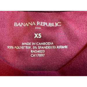 This is a good condition Banana Republic women's sleeveless tank top in burgundy, size XS. The fabric content is 95% polyester and 5% spandex/elastane. It features a crew neck, a relaxed fit, and a slightly curved hem. Measurements indicate an approximate length of 24.5 inches from shoulder to hem and a pit-to-pit width of 17.5 inches. No visible imperfections.