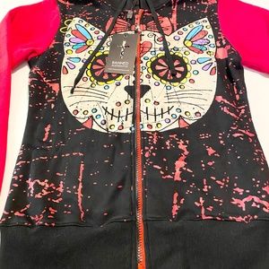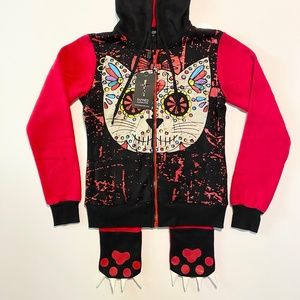 Embrace your meow in this dark and curious sweater! “Sugar Kitty Pow Hoodie” designed in England. Independence, protection, magic, mystery, cat spirit, power, street, alternative – lots of vibes and fun details. Complete with paws to keep you warm this fall and winter. Never worn and in excellent condition. Smoke-free household.