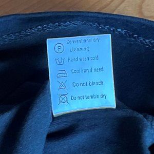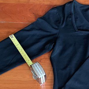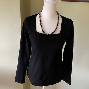 This basic, square-neck, long-sleeve tee is definitely slim-fitting. While the tag says 93% Cotton, 7% Spandex, its stretchy texture feels more like 93% Spandex and 3% Cotton--like a leotard. Nice, deep, rich, black color. The tag says Large, but I would say the size runs small. More like a medium?