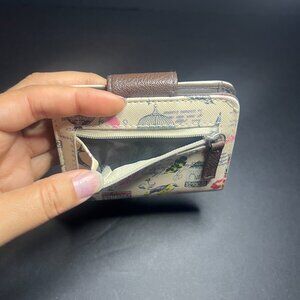 Selling a Women's Beautiful Beige and Brown Relic Bird Print Bifold Wallet. It measures 3.5" (h) x 4.5" (w), it has a snap button flap closure, an outer coin pocket with a zipper closure, and several inner card slots. It's in Great Condition!