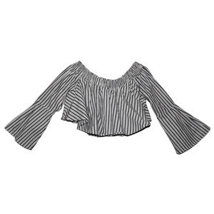 Women's Bebe Flounce Ruffle Off the Shoulder Crop Top White Gray Cotton Polyester Spandex Striped Casual Long Sleeve Crop Top Shirt Size Small (S)