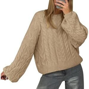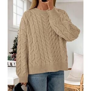 Womens Beige Cropped Chunky Cable Knit Oversized Cozy Fall Crew Neck Sweater LRG