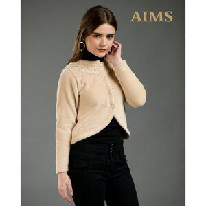 This cardigan, crafted by Aims, offers a sophisticated touch with its elegant embroidery and warm fleece material. The button closure design provides ease of wear, while the beige color ensures versatility in styling. Ideal for maintaining warmth and style in cooler weather settings.