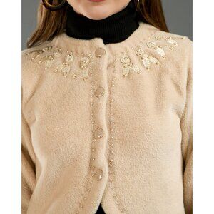 Women’s Beige Embroidered Fleece Cardigan With Button Closure