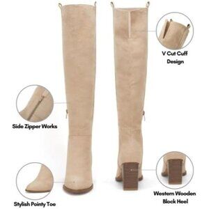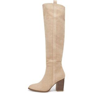 Womens Beige Faux Suede Knee High Side Zipper Chunky Heel Stretch Winter Boots