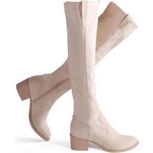 🆕Women's Beige Faux Suede Over The Knee Thigh High Chunky Heel Pointed Toe Boot
