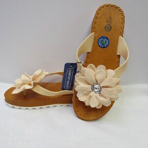 Women's Beige Flower Floral Design Summer Sandals wedge Slides Various Sizes NWT. Brand new cute slide sandals . Beige fabric bow with stone in the center .
