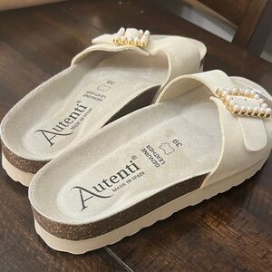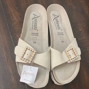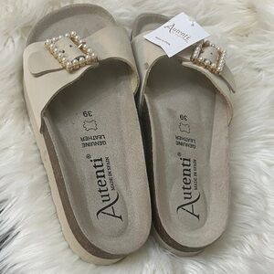 Elevate your style with 's beige leather mules. Featuring a sophisticated pearl-embellished buckle, these mules combine elegance and comfort effortlessly.