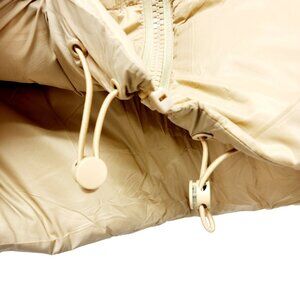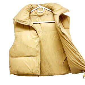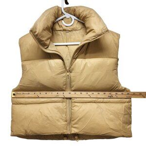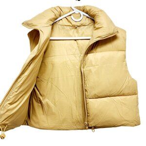 This medium-sized beige puffer vest offers lightweight warmth and versatility with its adjustable drawstrings and secure zipper closure, ideal for layering.