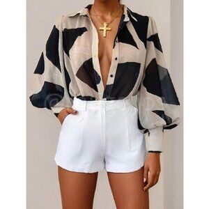 Women's Beige Sheer Abstract Print Button Up Shirt Long Bishop Sleeve