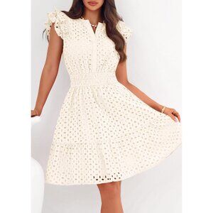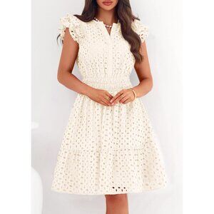 Women's Beige V Neck Eyelet Cap Sleeve Summer Beach Vacation Sundresseses