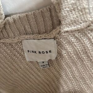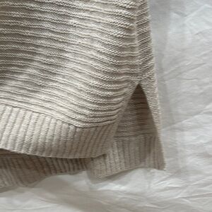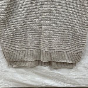 Stay cozy and stylish with this elegant beige V-neck sweater. Perfect tunic length for leggings or layering. Wide knit, not sheer but can see some skin through. I wore with a tank under. Back is a cross cross open design but doesn’t go low enough to see a bra. Front is deeper neck but doesn’t show too much cleavage. Split sides. Like new condition.