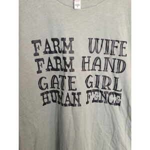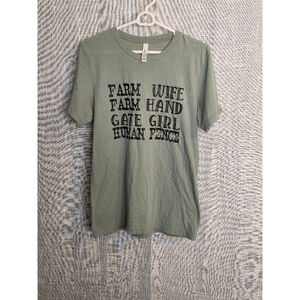 This is a pre-owned Bella+Canvas brand T-shirt, size medium. The shirt is a solid light green color with black printed text on the front. The text reads "FARM WIFE FARM HAND GATE GIRL HUMAN FENCE" in a stacked format. The shirt is made of a soft, lightweight material. There are no visible stains, tears, or holes.