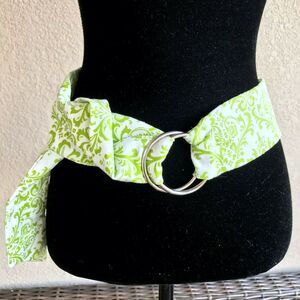 Womens Belt Chartreuse Lime Green Beige Damask Fabric Wide Round Rings NEW