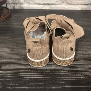 Step out in style with these chic tan slip-on knit sneakers. Featuring a stylish bow detail and a comfortable fit, these shoes are perfect for any casual outing. The subtle tan color adds a touch of elegance to your everyday look. But the sparkle detail on the foxing is the extra glam we all need.