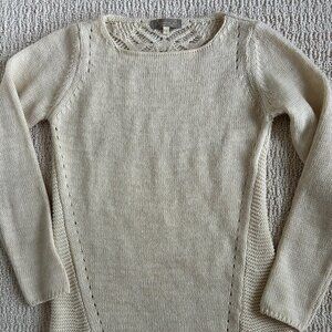 70% acrylic and 30% wool, delicate pullover sweater, color is ivory. The back on this sweater is almost all open weave with some small holes framing the sides of the sweater in the front. This has a hi-low bottom not quite as long as a tunic but longer than a regular pull over sweater. Smoke free home, condition is used very good.