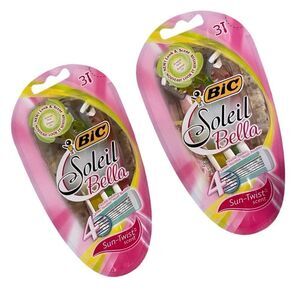 2 packages: Bic Soleil Bella with Sun-Twist scent, 3 blades, 4 flexible blades adjust to your curves.