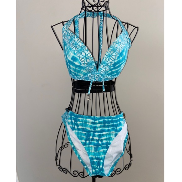 Cute bikini. Worn once! Size 10 bottoms. Cups and no wire. Top cup size C/D. Adjustable around bust. Ties around neck and Under bust. Very gently used. Missing beads on decorative tie on one side, but beads can be easily removed.