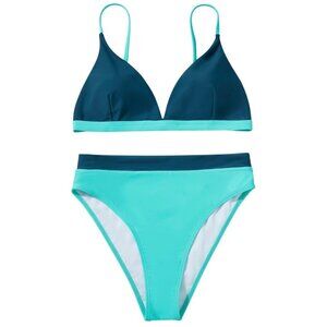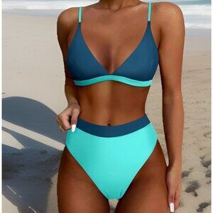 This two-piece swimsuit features a supportive triangle top with adjustable straps and a high-waisted bottom, providing a flattering fit. Crafted from quality materials for durability and comfort, its teal and navy blue hues offer a stylish, sleek look.