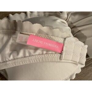 The product is a women's Victoria's Secret bikini top in white, size 34D. It is a scalloped swimsuit top designed for regular sizing. This two-piece bikini set is perfect for women looking for a stylish swimwear option with a flattering fit. The Victoria's Secret brand ensures quality and a trendy design, making this top a desirable choice for beach or poolside attire.