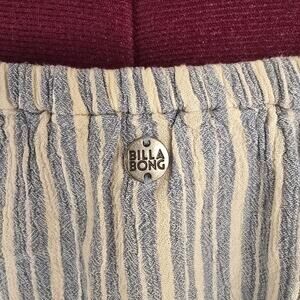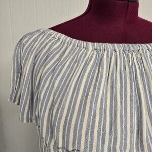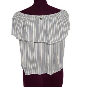 Women's Billabong blue and cream, off the shoulder cropped blouse/top. This top has an elastic collar and is lightweight. The blouse is flowy. This material doesn't stretch.