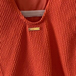 Stylish orange one piece with textured fabric. Ideal for beach outings.