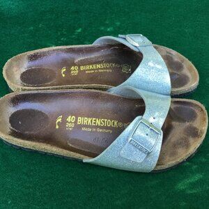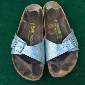 Women's Birkenstock silver adjustable buckle slip on sandals in a size 9.5. Please be sure to see all photos for the condition and size.
