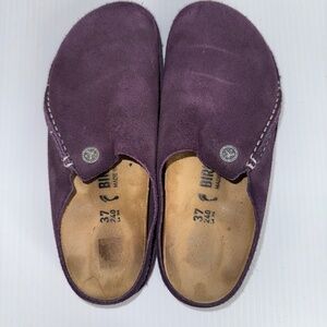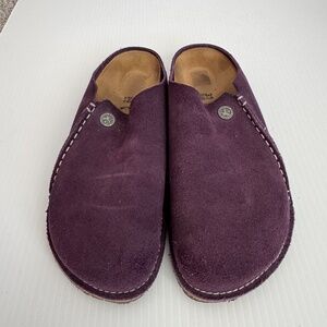 These Zermatt premium suede leather mules are a desirable, and no longer available berry/purple color. They are oh so comfortable. Very gently worn with lots of life left in them. A quick brush with a suede brush tool keeps them looking fresh.