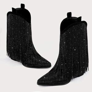 ⚡Women's Black Ankle Boots Western Rhinestone Sparkly Fringe Chunky Heel