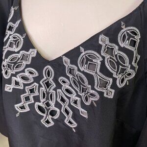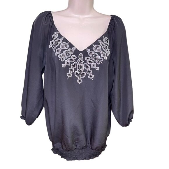 This chic and stylish 'White House Black Market' blouse is ideal for women seeking a sophisticated look. It features a lightweight design, classic black color, balloon sleeves, a V-neck, and an elastic waist. The blouse is adorned with subtle embroidered embellishments and is a size M.