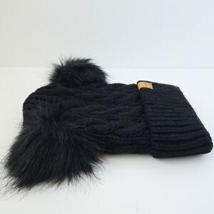 Brand new, made by Winuesa. Made of 100% acrylic, 100% polyester. Fleece lined on the inside and cable knit on the outside. Has two cute fuzzy pom poms on both sides!