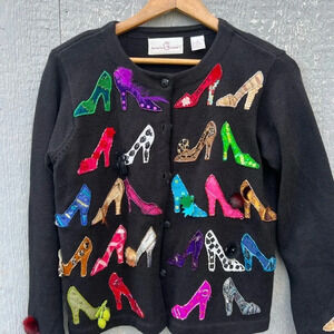 Elevate your wardrobe with the Women's Black Cardigan, featuring a vibrant shoe design. Perfect for adding a pop of color to any outfit.