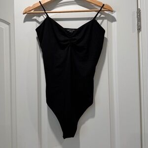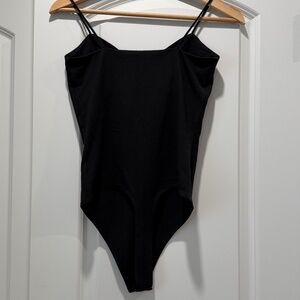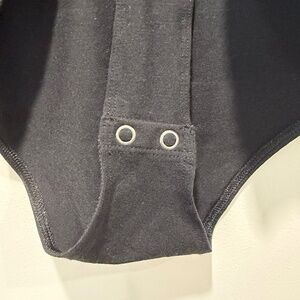 A comfy, casual, black bodysuit featuring a synched front and compression. Perfect for with skirts in the summer or layering with sweaters in the fall! EXCELLENT condition. Never worn.